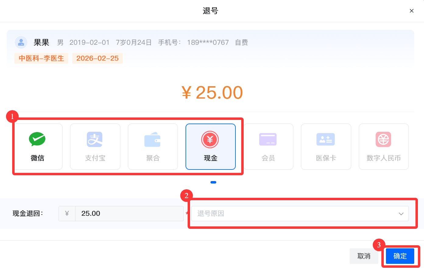 3.选择“微信”或者“现金”,选择退号原因,点击“确定”后退号成功。