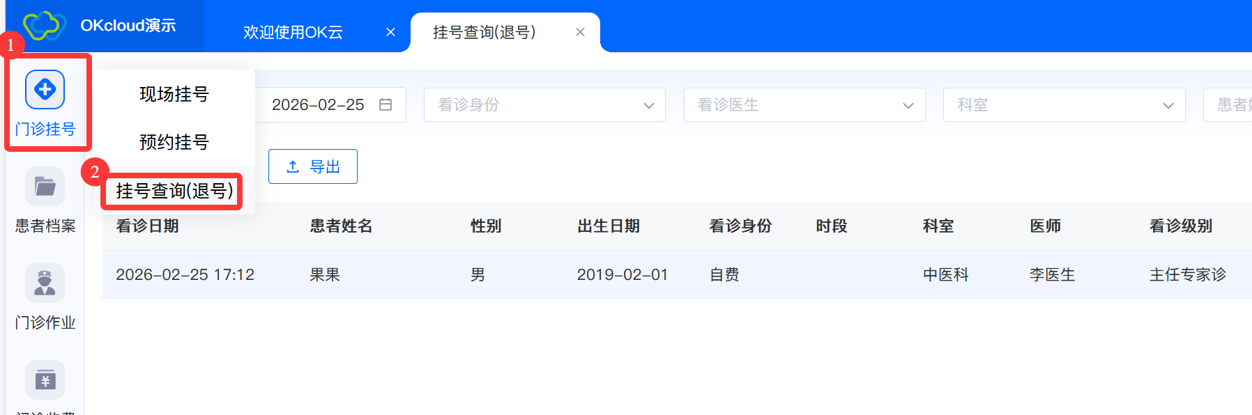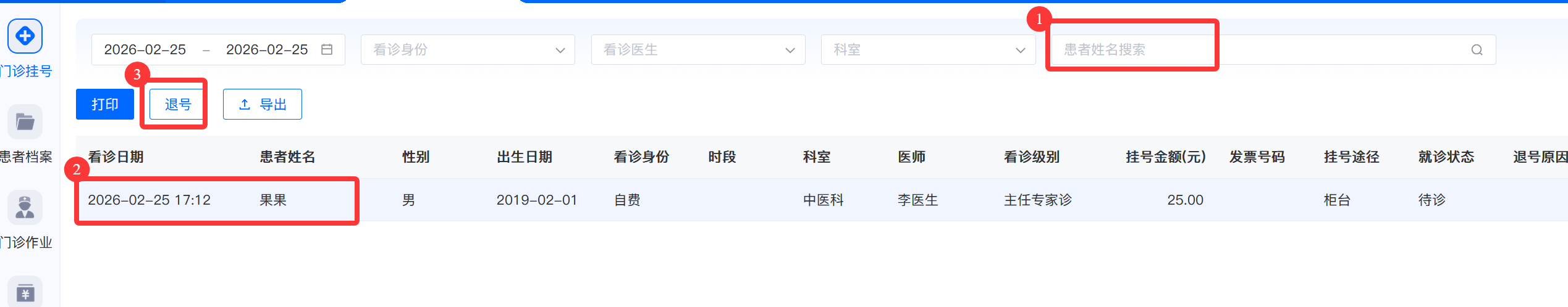 1.挂号信息查询 -> 2.选中已挂号信息-> 3.退号