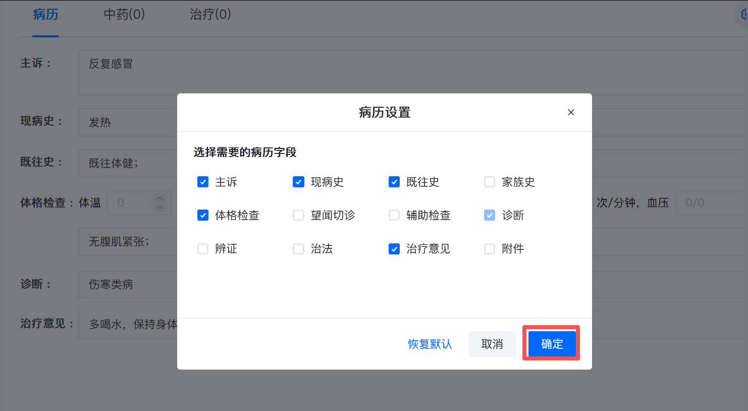 4.点击【病历设置】,勾选需要显示的栏目,点击确定即可。