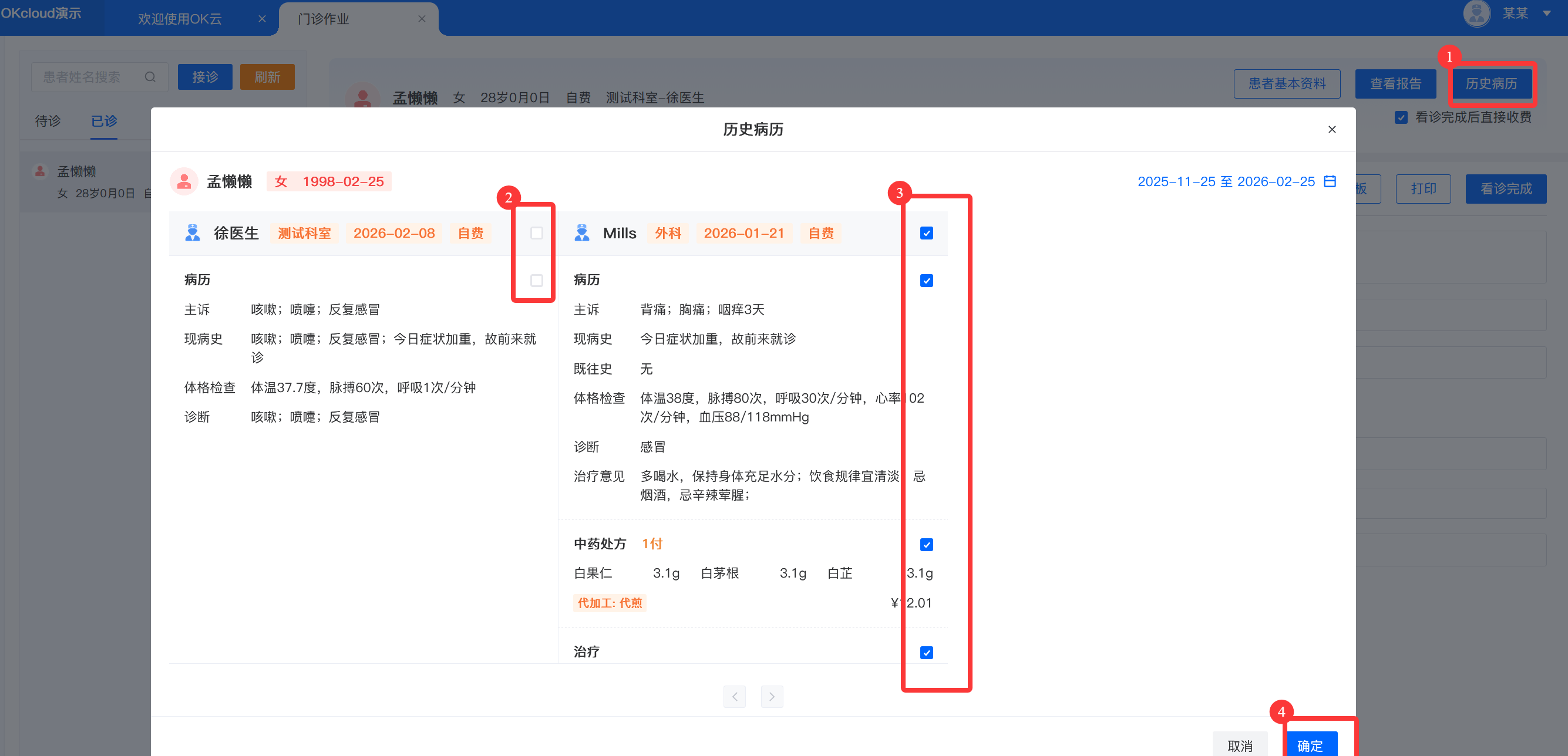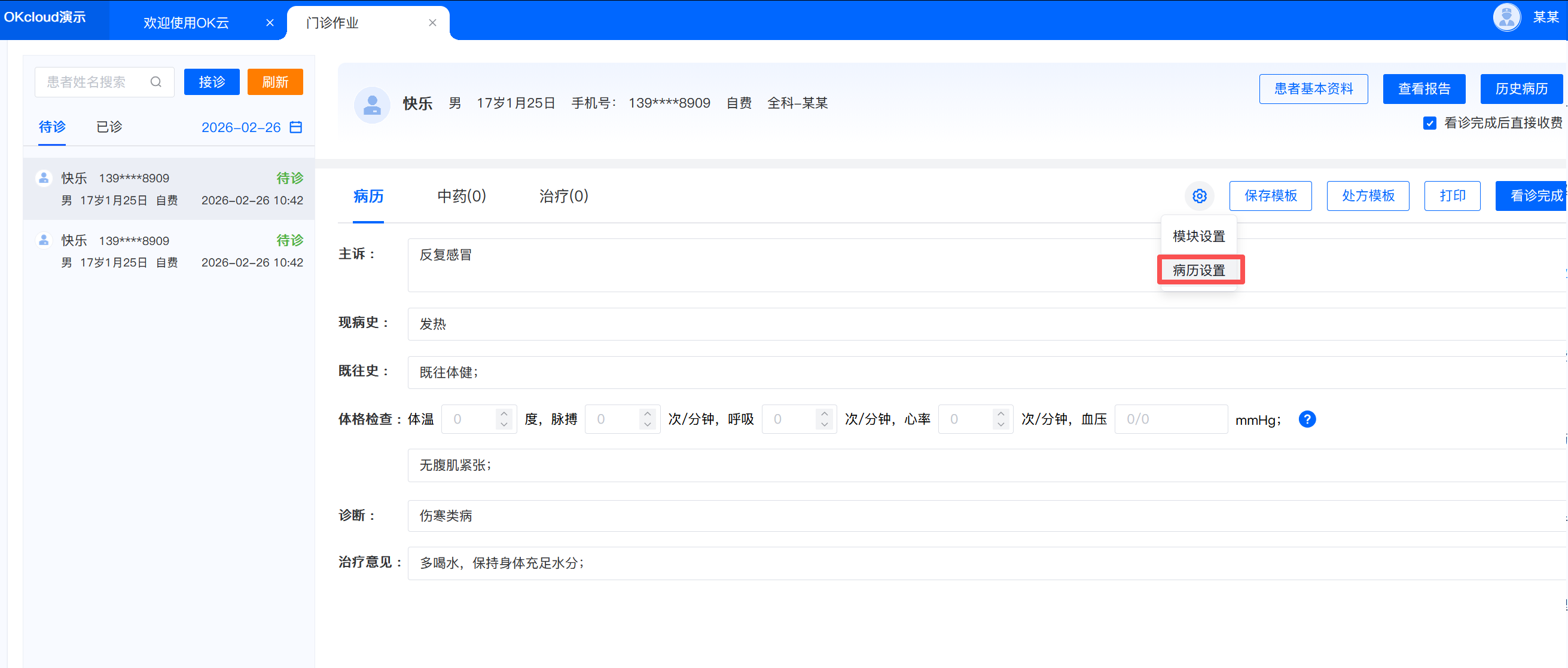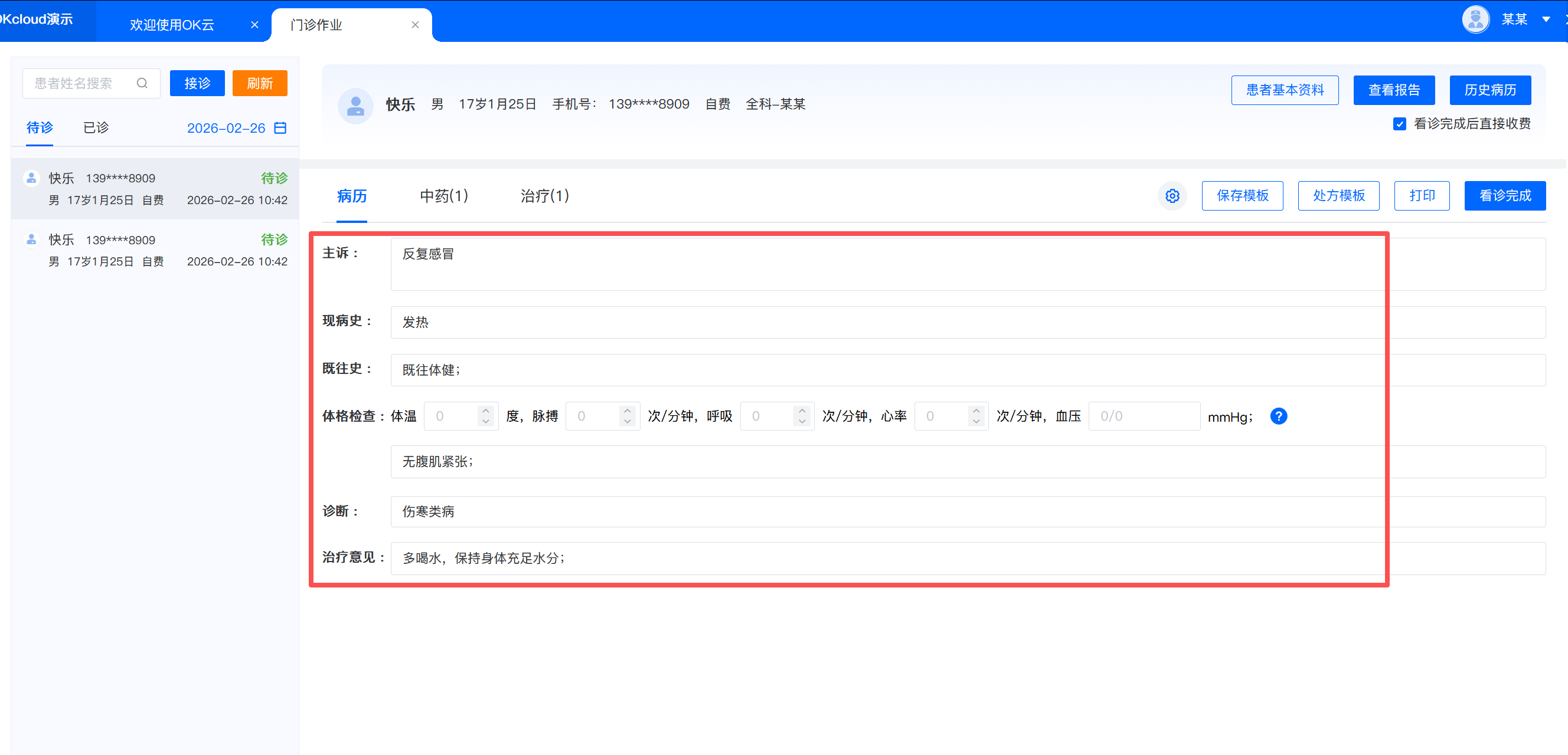 1.接诊 -> 2.病历填写-> 3.中药信息填写-> 4.治疗信息填写-> 5.看诊完成具体操作