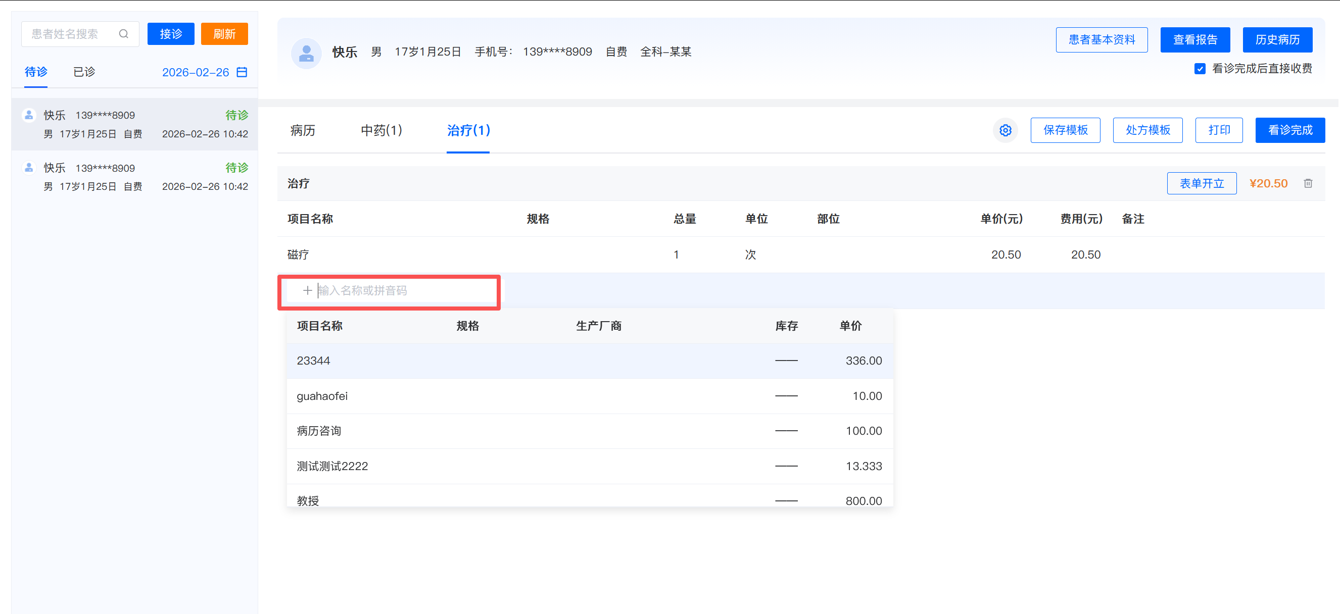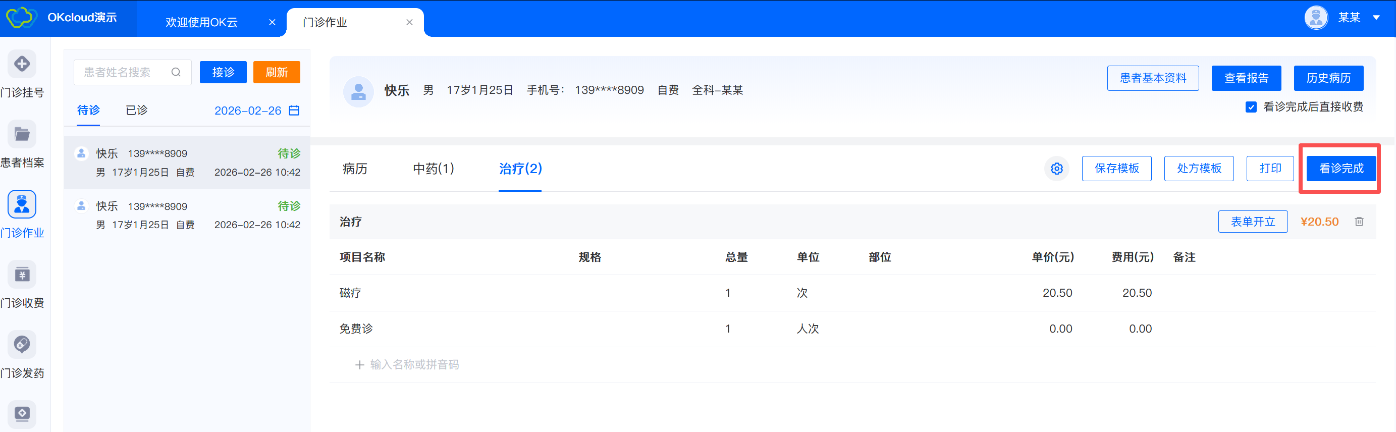 8.病历、中药、治疗等模块的内容都填写完成后,点击【看诊完成】。