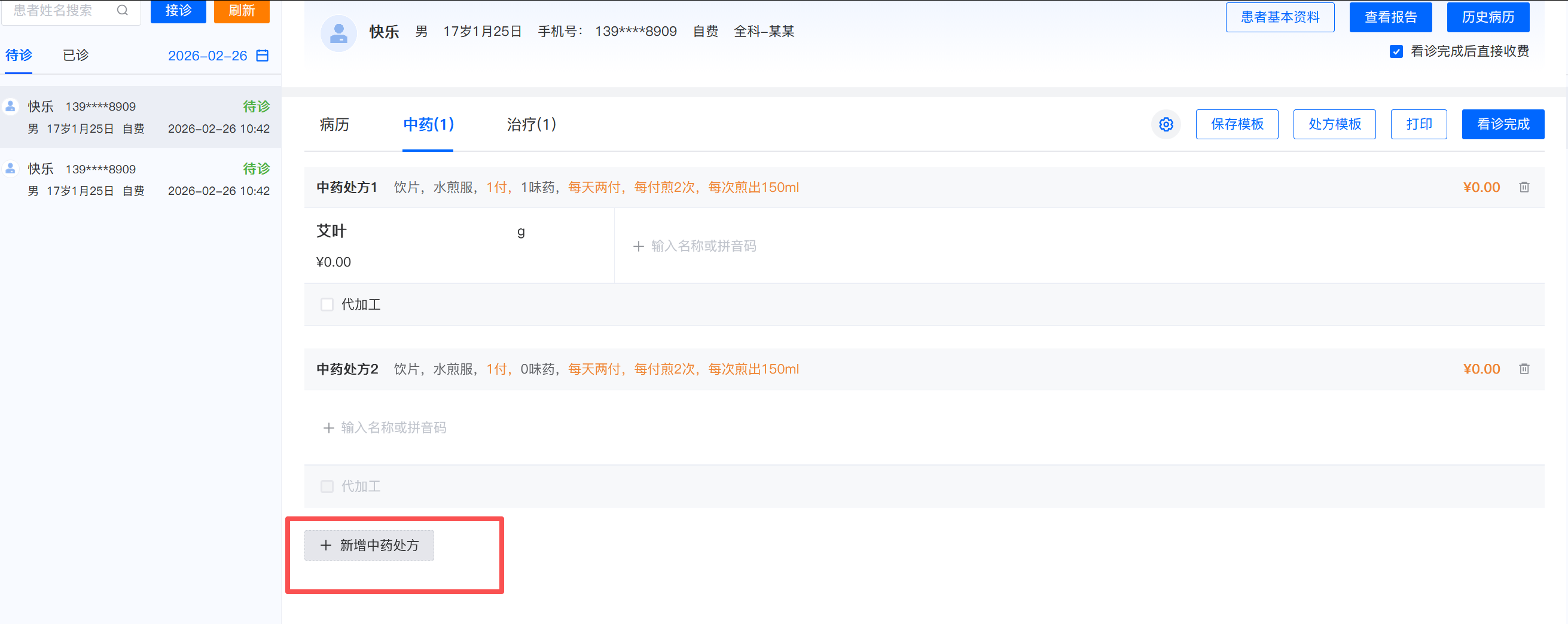 6.点击【新增中药处方】根据药品名称搜索所需的药品,填写每味中草药的剂量、煎法,中草药处方的用法、付数、服用剂量可修改。同一药品不可添加在同一处方中。库存不足的药品不可添加。支持全键盘操作。若药品需代加工可收取代加工费用。