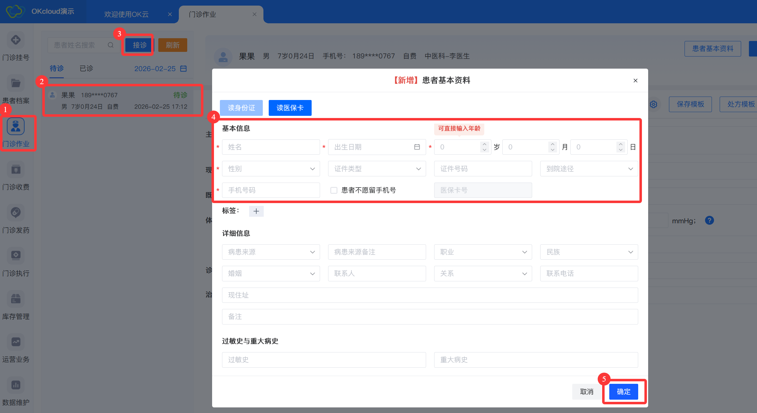 1.登录系统后,点击【门诊作业】,选择待诊患者,点击【接诊】,弹出患者基本资料对话框,录入患者信息保存后即可看诊。支持读取患者身份证、医保卡加载患者信息。
