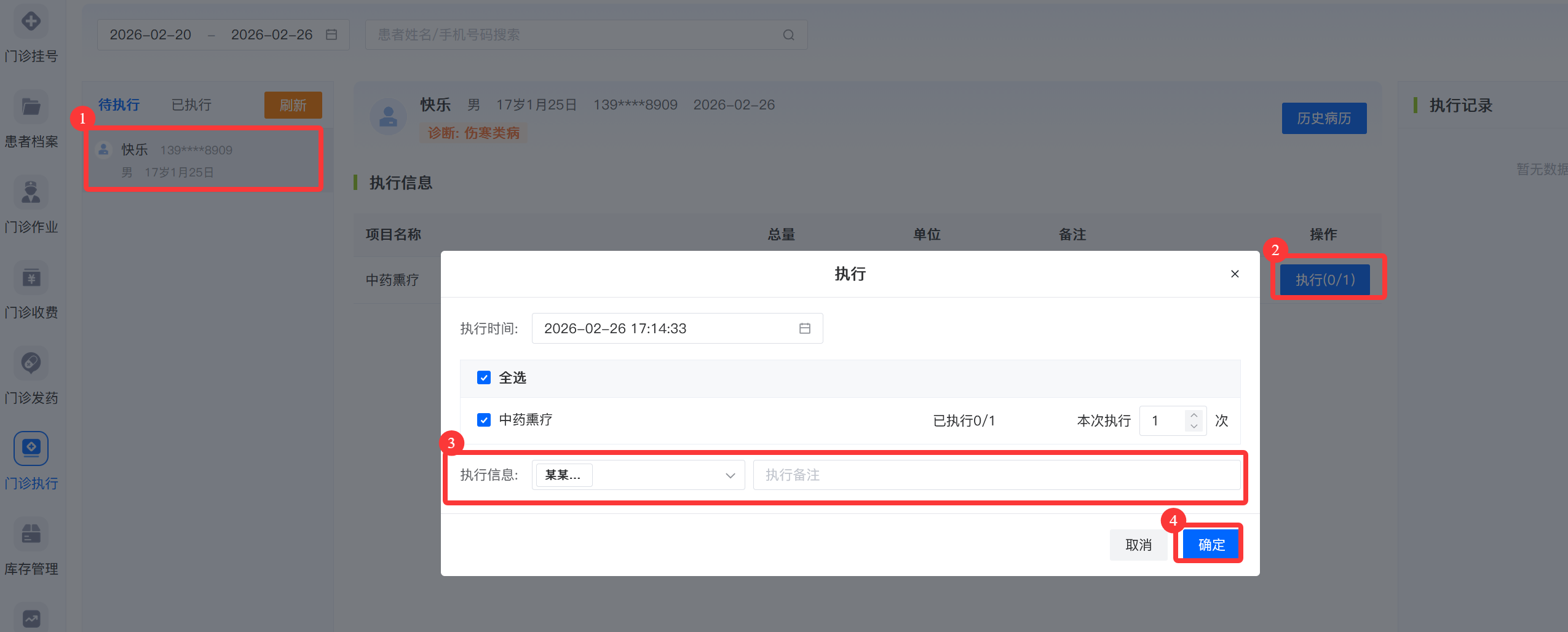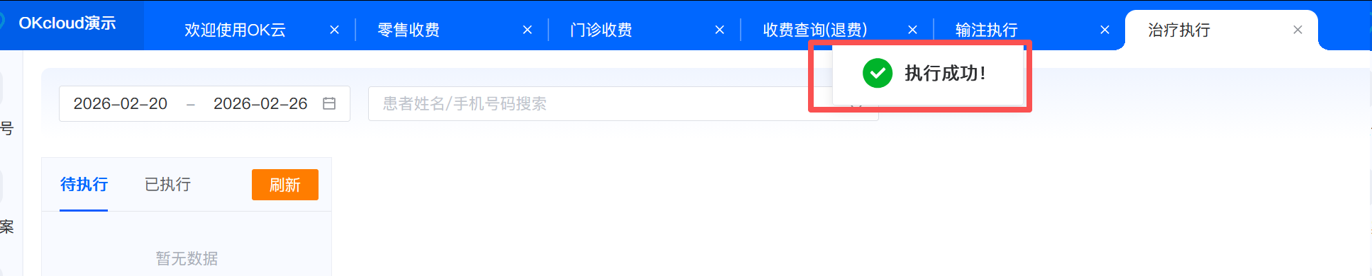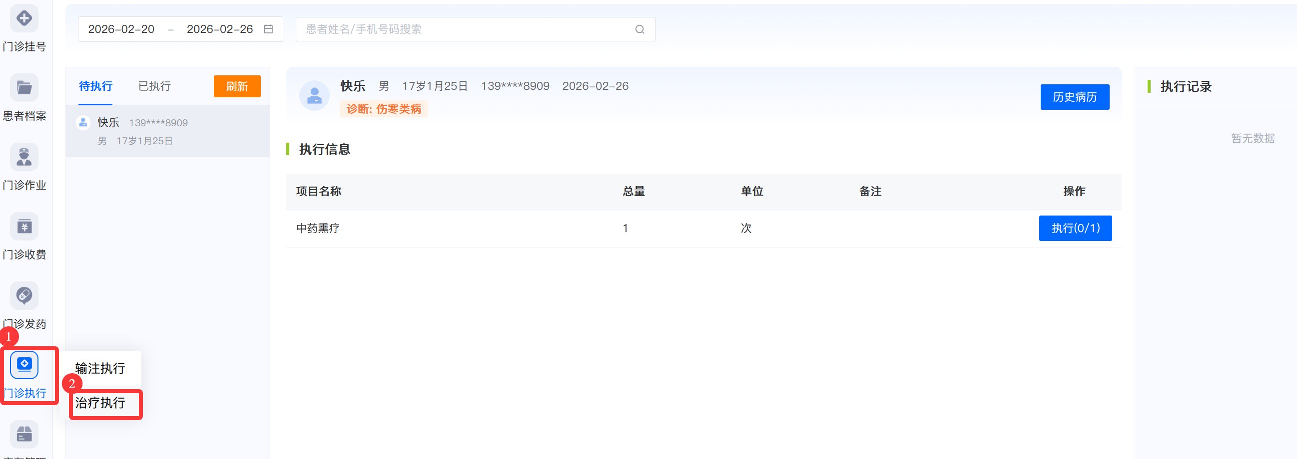 业务介绍该功能页面展示已收费项目中含有治疗项目的患者信息,分待执行和已执行列表,治疗项目做完后,可将待执行的患者调整为“已执行”。 治疗执行流程 1.进入待执行患者列表页 -> 2.选择需执行患者-> 3.确定执行 具体操作 1.登录系统后,点击【门诊执行】->【治疗执行】,进入待执行患者信息列表页。 2.选择待执行患者,点击【执行】,选择需要执行的项目和执行信息后,点击【确定】后即执行成功。也可对已执行的患者信息取消执行。 文档更新时间: 2026-02-26 17:39 作者:刘兰兰