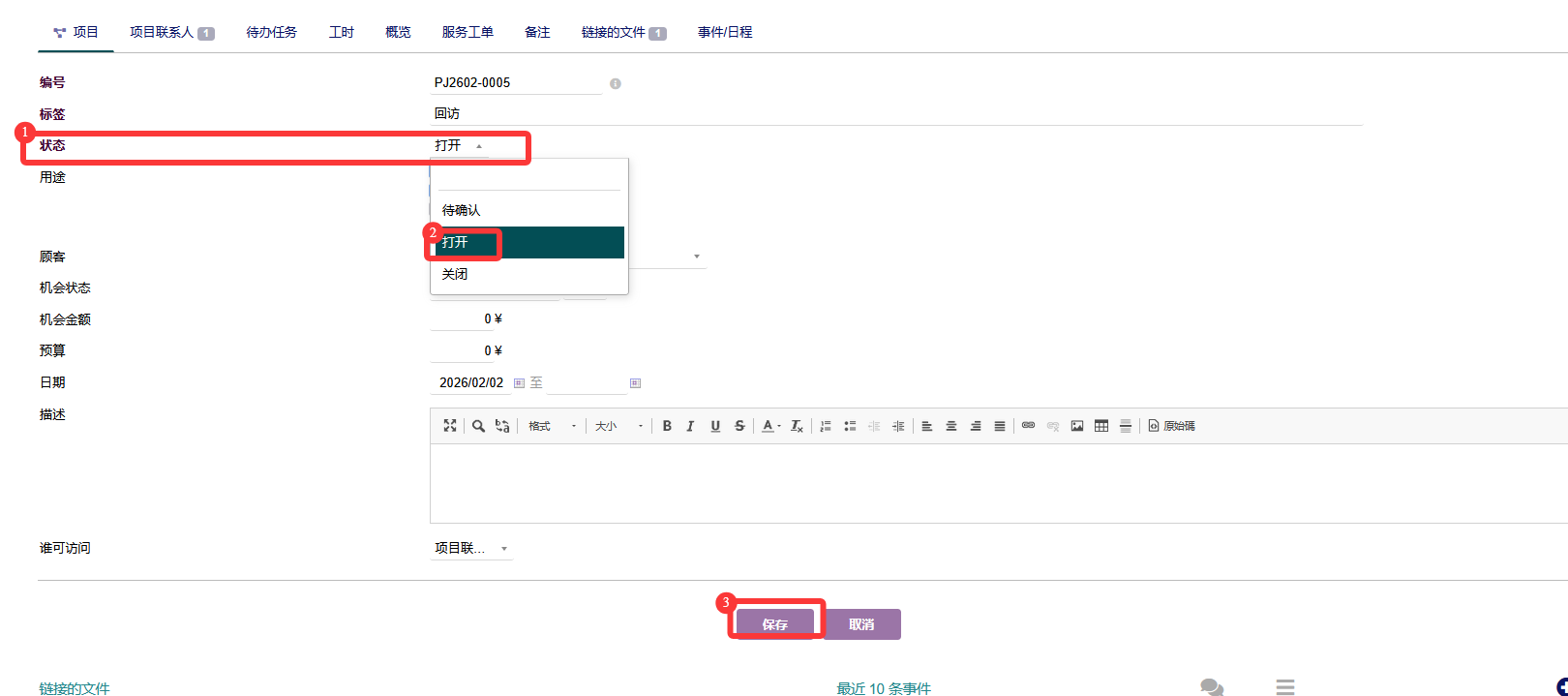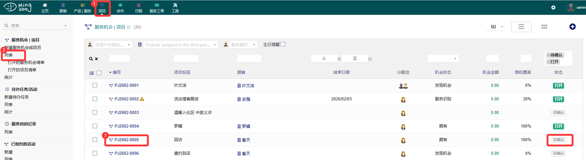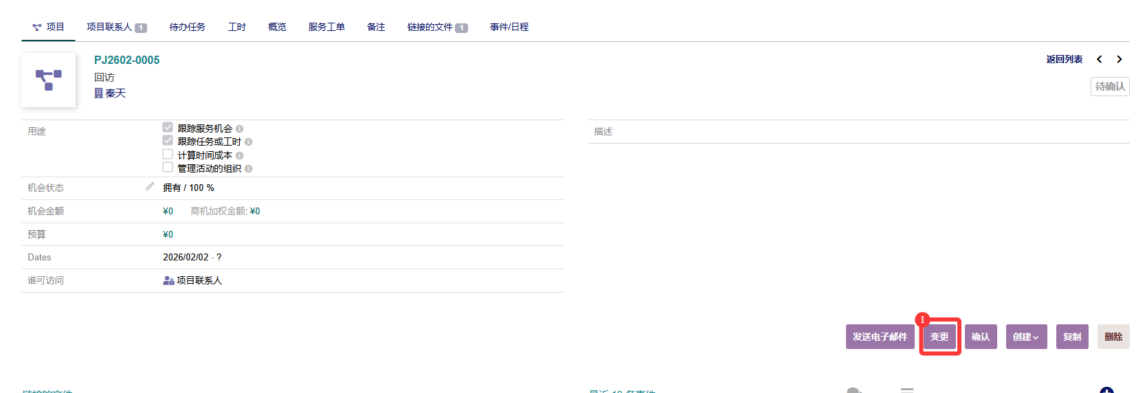 业务介绍顾客对应机会初始状态为待确认,当开始服务顾客时,将机会启用 启用机会流程 1.选择机会 -> 2.启用 具体操作 1.进入PCM界面,点击【项目】->【列表】,选择待确认的机会,点击机会编号进入详情 2.点击变更,进入机会变更页 3.选择状态为【打开】,点击【保持】 文档更新时间: 2026-02-13 16:04 作者:孟庆辉