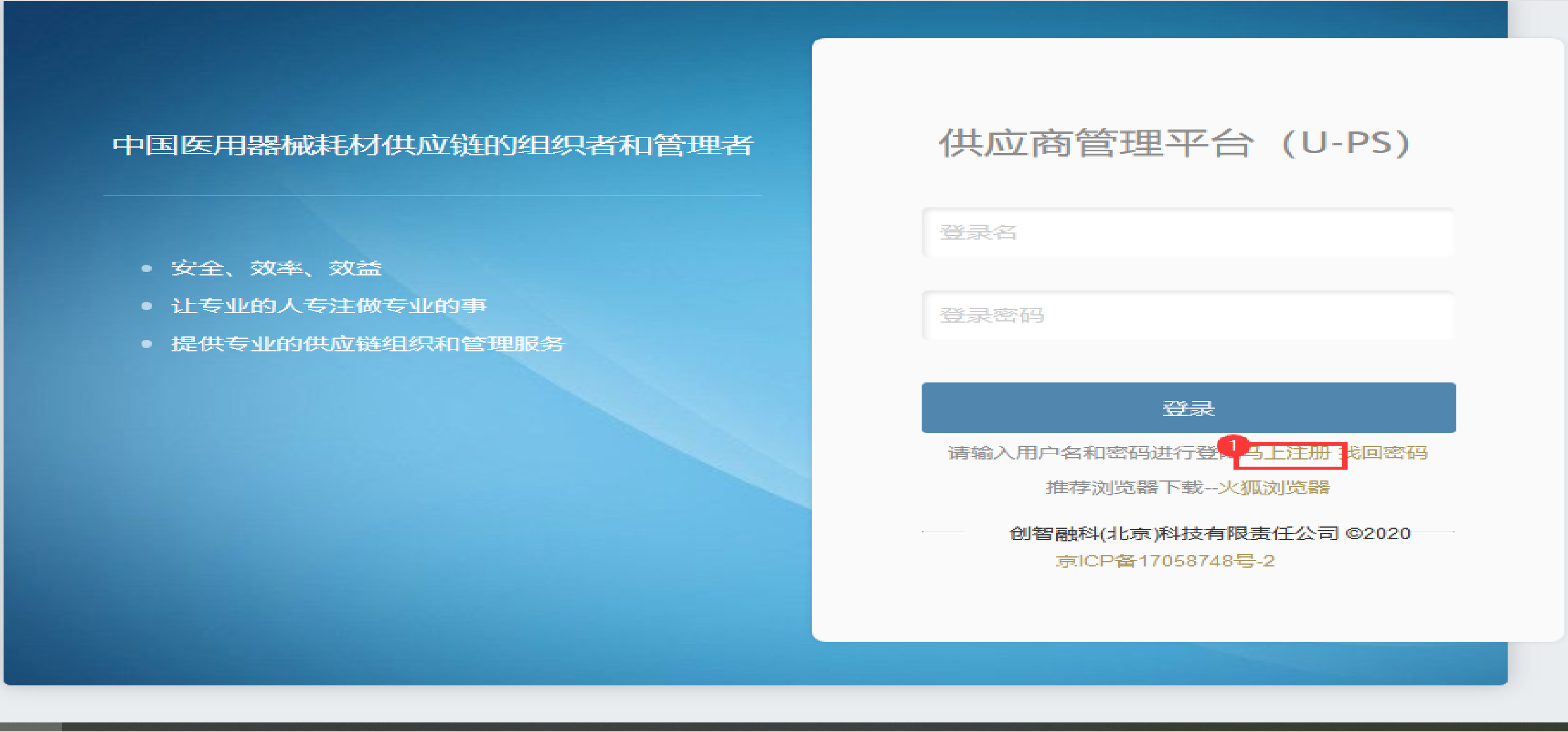 1.输入网址登录供应商管理平台,点击【马上注册】。