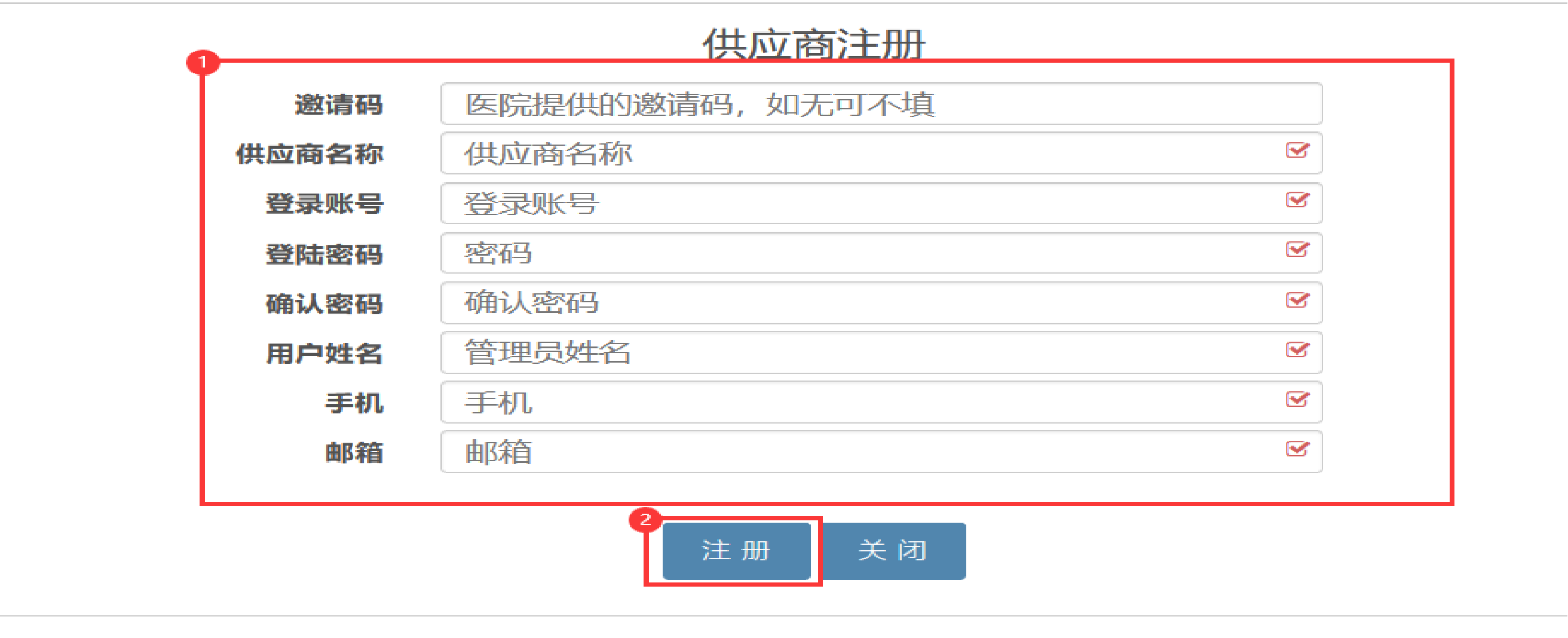 邀请码:有邀请码的可以填写,没有邀请码的供应商可以不填写。(供应商线下与医疗机构进行磋商后确定供应关系,已获得医疗机构授权的用户,医疗机构提供一个邀请码,填入邀请码之后,供应商在KESHIKU系统中自动与医疗机构建立供应关系。)供应商名称:必须填入供应商营业执照上的详细名称登录账号:可以根据需要进行确定。(该账号为供应商管理员账号)登录密码:密码长度6-30个字符,使用字母或数字确认密码:需要与登录密码一致用户姓名:该登录账号的用户身份证上的姓名(也是供应商管理U-PS的管理员真实姓名)手机:该登录账号的用户的经常使用的手机号码,系统发送信息的时候首先发送该用户手机号。邮箱:该登录账号的能够正常接收邮件的邮箱,系统发送邮件优先发送到该邮箱。